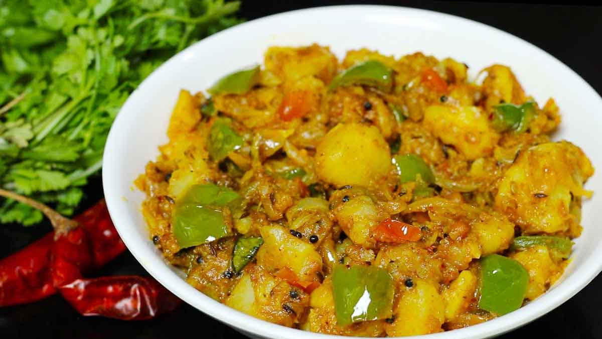 ఉడికించిన బంగాళాదుంపలు – పావు కిలో, నూనె – ఒక టేబుల్ స్పూన్, తాళింపు గింజలు – ఒక టేబుల్ స్పూన్, పొడుగ్గా తరిగిన ఉల్లిపాయ – 1, తరిగిన పచ్చిమిర్చి – 2, కరివేపాకు – ఒక రెమ్మ, చిన్నగా తరిగిన క్యాప్సికం – 1, తరిగిన టమాట – 1, ఉప్పు – తగినంత, పసుపు – అర టీ స్పూన్, పసుపు – అర టీ స్పూన్, కారం – ఒక టేబుల్ స్పూన్, కచ్చా పచ్చాగా దంచిన వెల్లుల్లి రెబ్బలు – 3, గరం మసాలా – ఒక టీ స్పూన్, తరిగిన కొత్తిమీర – కొద్దిగా.