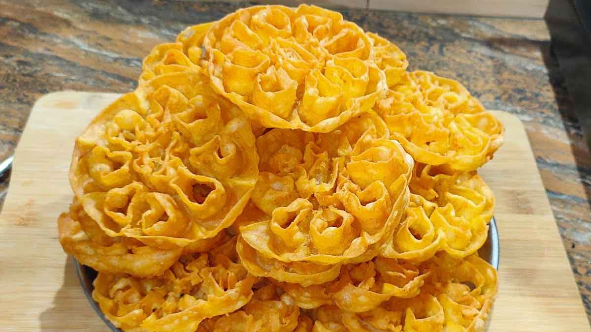 ముందుగా ఒక గిన్నెలో బియ్యం పిండిని తీసుకోవాలి. తరువాత ఇందులో మైదా, శనగపిండి, ఉప్పు, కారం, నువ్వులు వేసి కలపాలి. తరువాత తగినన్ని నీళ్లు పోసుకుంటూ పిండిని ఉండలు లేకుండా కలుపుకోవాలి. అలాగే పిండి మరీ పలుచగా, మరీ చిక్కగా కాకుండా చూసుకోవాలి. ఇప్పుడు కళాయిలో నూనె పోసి వేడి చేయాలి. ఈ నూనెలోనే గులాబి పువ్వుల గుత్తిని కూడా వేసి వేడి చేయాలి. నూనె వేడయ్యాక ఈ గుత్తిని ముప్పావు వంతు వరకు పిండిలో ముంచి నూనెలో వేసుకోవాలి. ఇది కొద్దిగా కాలిన తరువాత పిండి దానంతట అదే గుత్తి నుండి వేరవుతుంది లేదా చాకుతో నెమ్మదిగా వేరు చేసుకోవాలి.