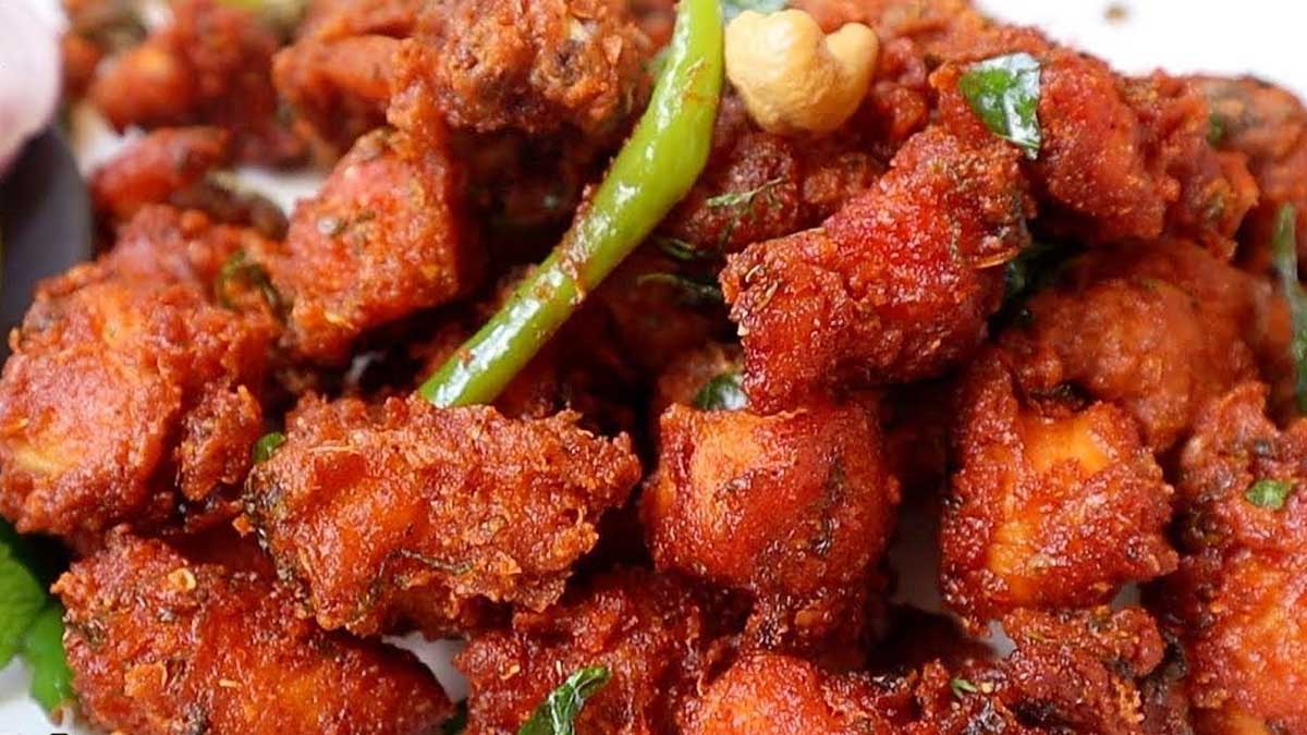 చికెన్ – అరకిలో, అల్లం వెల్లుల్లి పేస్ట్ – ఒక టేబుల్ స్పూన్, కారం – 2 టీ స్పూన్స్, రెడ్ ఫుడ్ కలర్ – చిటికెడు, ఉప్పు – తగినంత, ధనియాల పొడి – అర టీ స్పూన్, పసుపు – పావు టీ స్పూన్, గరం మసాలా – ఒక టీ స్పూన్, జీలకర్ర పొడి -అర టీ స్పూన్, నూనె – డీప్ ఫ్రైకు సరిపడా, నిమ్మరసం – అర చెక్క, తరిగిన పచ్చిమిర్చి – 3, కరివేపాకు – రెండు రెమ్మలు, సన్నగా తరిగిన కొత్తిమీర – కొద్దిగా, కార్న్ ఫ్లోర్ – 2 నుండి 3 టేబుల్ స్పూన్స్, బియ్యం పిండి – 2 టేబుల్ స్పూన్స్.