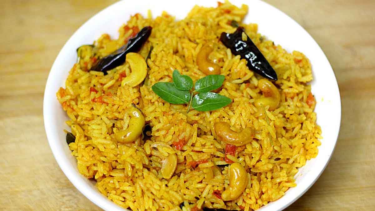 ముందుగా కళాయిలో నూనె వేసి వేడి చేయాలి. తరువాత మసాలా దినుసులు, ఎండుమిర్చి వేసి వేయించాలి. తరువాత పచ్చిమిర్చి, జీడిపప్పు వేసివేయించాలి. తరువాత ఉల్లిపాయ ముక్కలు వేసి వేయించాలి. ఉల్లిపాయ ముక్కలు వేగిన తరువాత కరివేపాకు, అల్లం వెల్లుల్లి పేస్ట్ వేసి వేయించాలి. తరువాత టమాట ముక్కలు వేసి మెత్తగా అయ్యే వరకు వేయించాలి. టమాట ముక్కలు మగ్గిన తరువాత పసుపు, కారం, ధనియాల పొడి, జీలకర్ర పొడి, ఉప్పు వేసి కలపాలి. తరువాత బియ్యం వేసి కలపాలి.