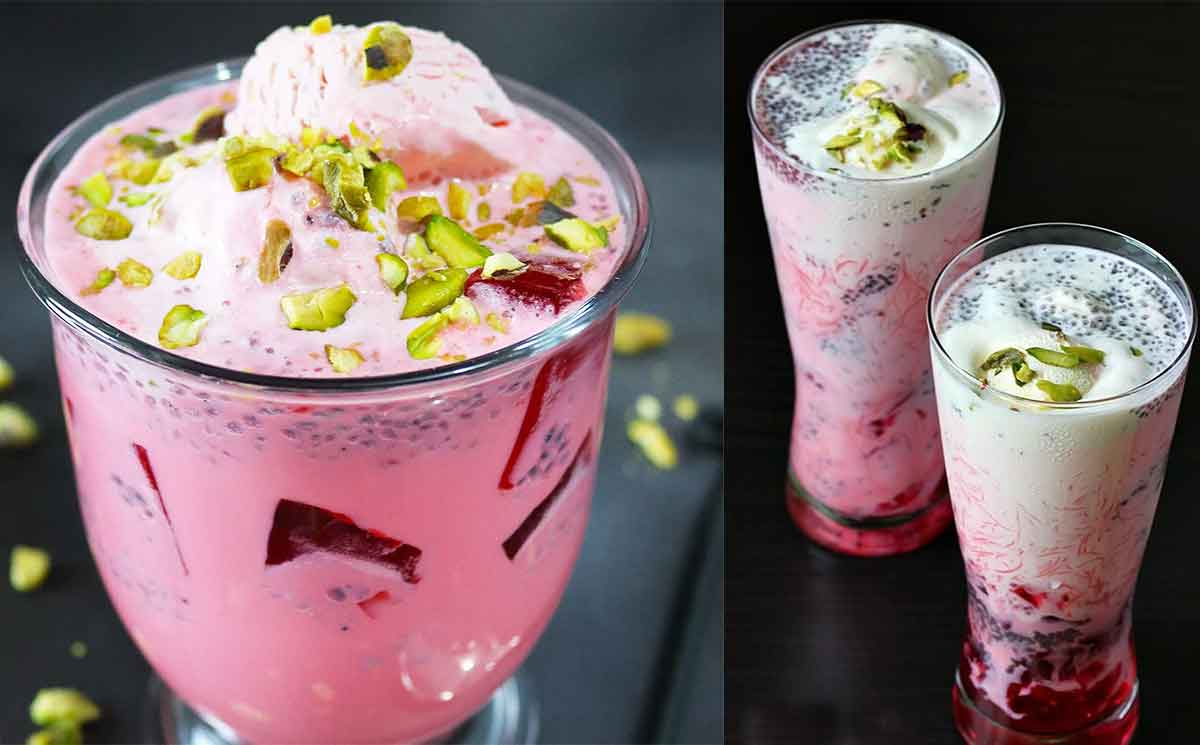 పాలు – 2 కప్పులు, స్ట్రాబెర్రీ జామ్ – అర కప్పు, రోజ్ సిరప్ లేదా రూఅఫ్జా – 3 టేబుల్ స్పూన్లు, నానబెట్టిన సబ్జా గింజలు – పావు కప్పు, ఉడికించిన సేమ్యా – పావు కప్పు, పిస్తాం, బాదం పప్పు తురుము – 2 టీస్పూన్ల చొప్పున, వెనిల్లా ఐస్క్రీమ్ – 4 స్కూప్స్, చక్కెర – రుచికి సరిపడా.