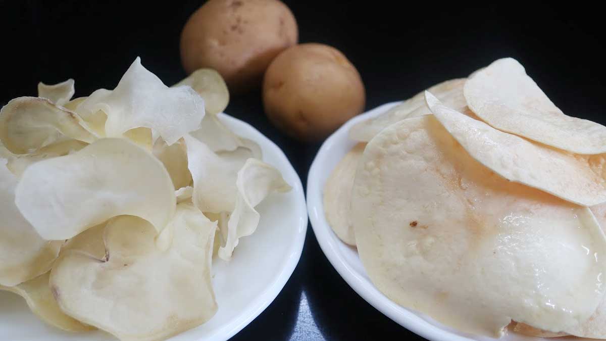 ముందుగా బంగాళాదుంపలపై ఉండే పొట్టును తీసేసి నీటిలో వేసుకోవాలి. తరువాత ఒక్కో బంగాళాదుంపను తీసుకుని స్లైసర్ సహాయంతో స్లైస్ లుగా కట్ చేసుకోవాలి. తరువాత వీటిని నీటిలో వేసి బాగా కడగాలి. తరువాత గిన్నెలో నీటిని తీసుకుని అందులో ఉప్పు వేసి వేడి చేయాలి. నీళ్లు వేడయ్యాక బంగాళాదుంప స్లైస్ లను వేసి రెండు నిమిషాల పాటు ఉడికించి స్టవ్ ఆఫ్ చేసుకోవాలి. తరువాత వీటిని నీరంతా పోయేలా పూర్తిగా వడకట్టాలి. తరువాత శుభ్రమైన వస్త్రంపై ఈ బంగాళాదుంప స్లైస్ లను ఒక్కొక్కటిగా వేసి ఎండలో ఉంచి ఎండబెట్టాలి.