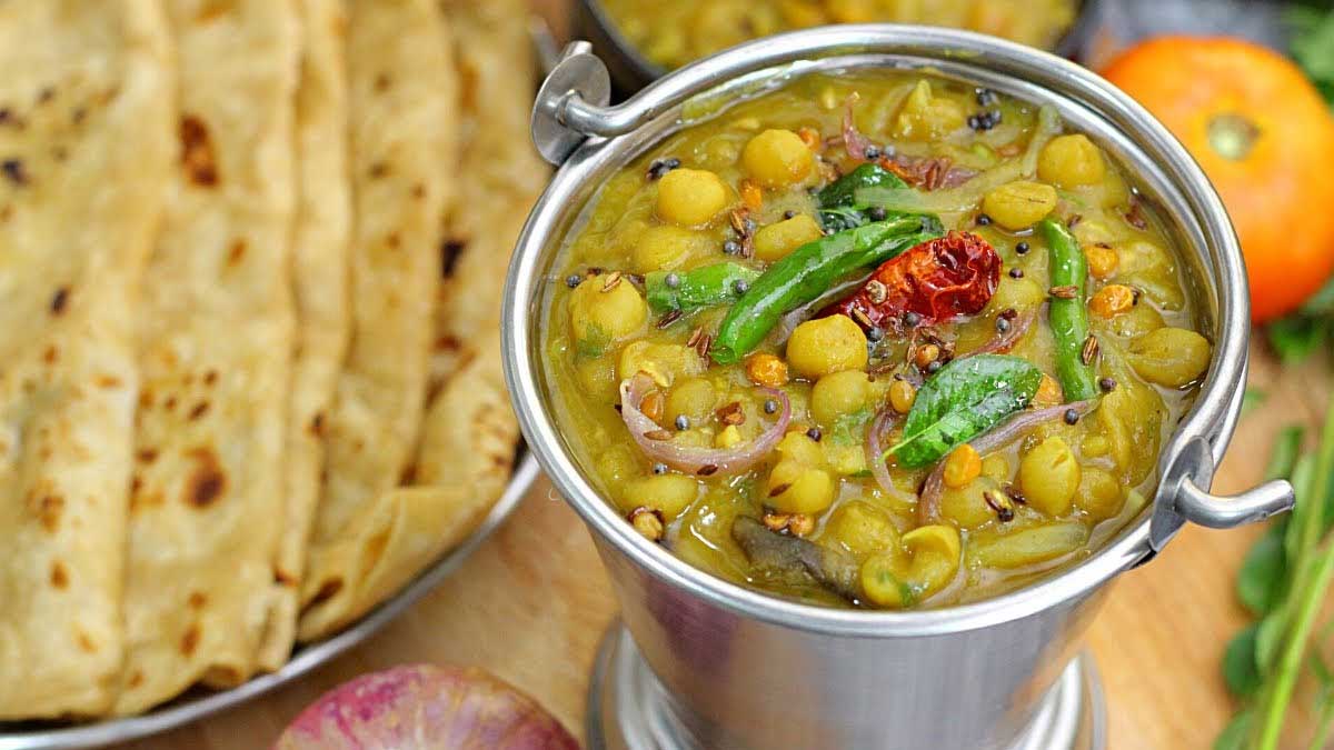 ఎండిన బఠాణీ – ఒక కప్పు, నీళ్లు – ఒక గ్లాస్, వంటసోడా – పావు టీ స్పూన్, ఉప్పు – తగినంత, నూనె – 2 టేబుల్ స్పూన్స్, తాళింపు దినుసులు – ఒక టేబుల్ స్పూన్, ఎండుమిర్చి – 2, దంచిన వెల్లుల్లి రెబ్బలు – 6, తరిగిన పచ్చిమిర్చి – 7, కరివేపాకు – ఒక రెమ్మ, సన్నగా పొడుగ్గా తరిగిన ఉల్లిపాయ – 1, చిన్నగా తరిగిన టమాటాలు – 2, ధనియాల పొడి – ఒక టీ స్పూన్, పసుపు – పావు టీ స్పూన్, జీలకర్ర పొడి – పావు టీ స్పూన్, గరం మసాలా – అర టీ స్పూన్, తరిగిన కొత్తిమీర – కొద్దిగా.
