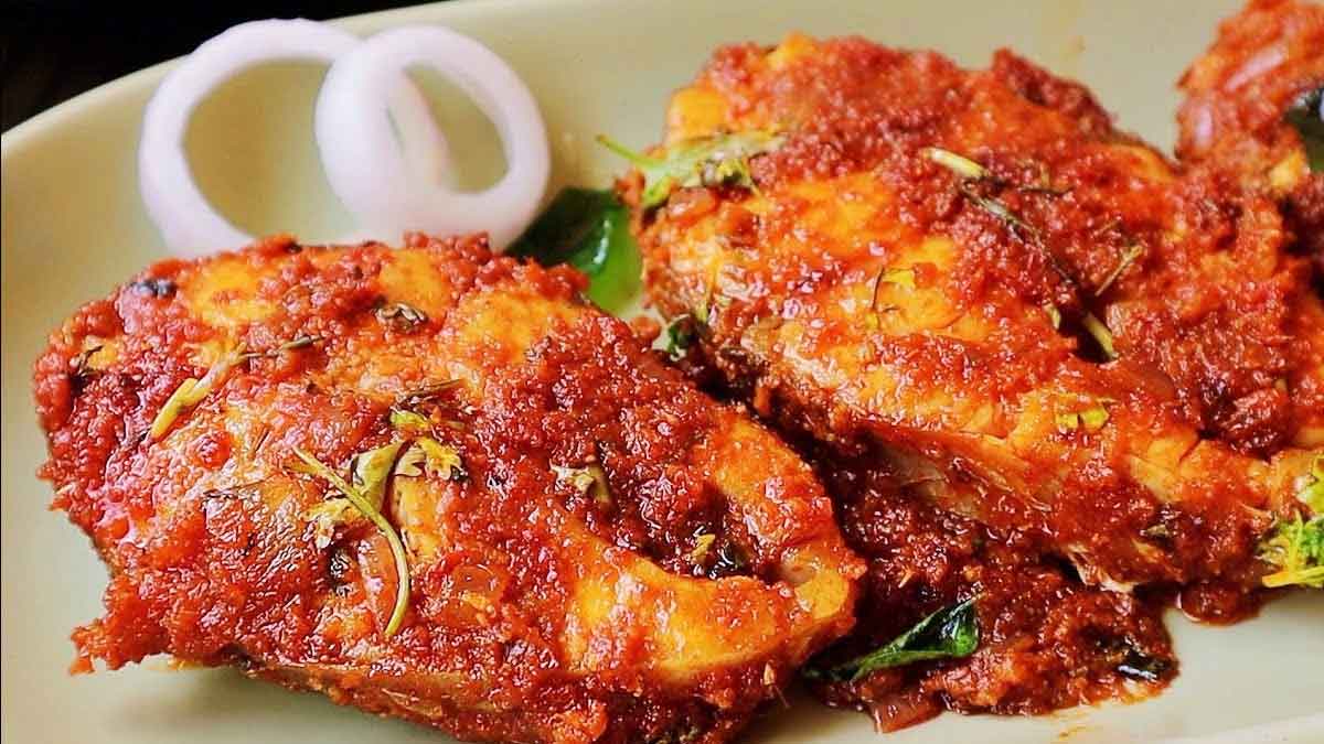 ముందుగా చేప ముక్కలను ఉప్పు వేసి శుభ్రంగా కడగాలి. తరువాత వీటిని నీళ్లు లేకుండా చేసుకుని గిన్నెలోకి తీసుకోవాలి. తరువాత ఇందులో మ్యారినేషన్ కు కావల్సిన పదార్థాలు వేసి బాగా కలపాలి. తరువాత వీటిని అర గంట నుండి గంట పాటు మ్యారినేట్ చేసుకోవాలి. తరువాత ఉల్లిపాయలను మంటపై కాల్చుకోవాలి. ఇవి చల్లారిన తరువాత పై ఉండే పొట్టును తీసేసి ముక్కలుగా కట్ చేసుకుని జార్ లో వేసుకోవాలి. ఇందులోనే అల్లం, వెల్లుల్లి రెబ్బలు కూడా వేసి మెత్తగా మిక్సీ పట్టుకోవాలి. తరువాత మరో కళాయిలో మెంతులు, జీలకర్ర, ధనియాలు వేసి వేయించాలి. తరువాత వీటిని కూడా జార్ లో వేసి పొడిగా చేసుకోవాలి. అలాగే టమాట ముక్కలను కూడా పేస్ట్ లాగా చేసుకోవాలి. ఇప్పుడు వెడల్పుగా ఉండే కళాయిలో నూనె వేసి వేడి చేయాలి. తరువాత జీలకర్ర, కరివేపాకు వేసి వేయించాలి. తరువాత ఉల్లిపాయ ముక్కలు వేసి వేయించాలి. ఇవి కొద్దిగా వేగిన తరువాత ఉల్లిపాయ పేస్ట్ వేసి వేయించాలి. వీటిని నూనె పైకి తేలే వరకు వేయించిన తరువాత టమాట పేస్ట్ వేసి వేయించాలి.