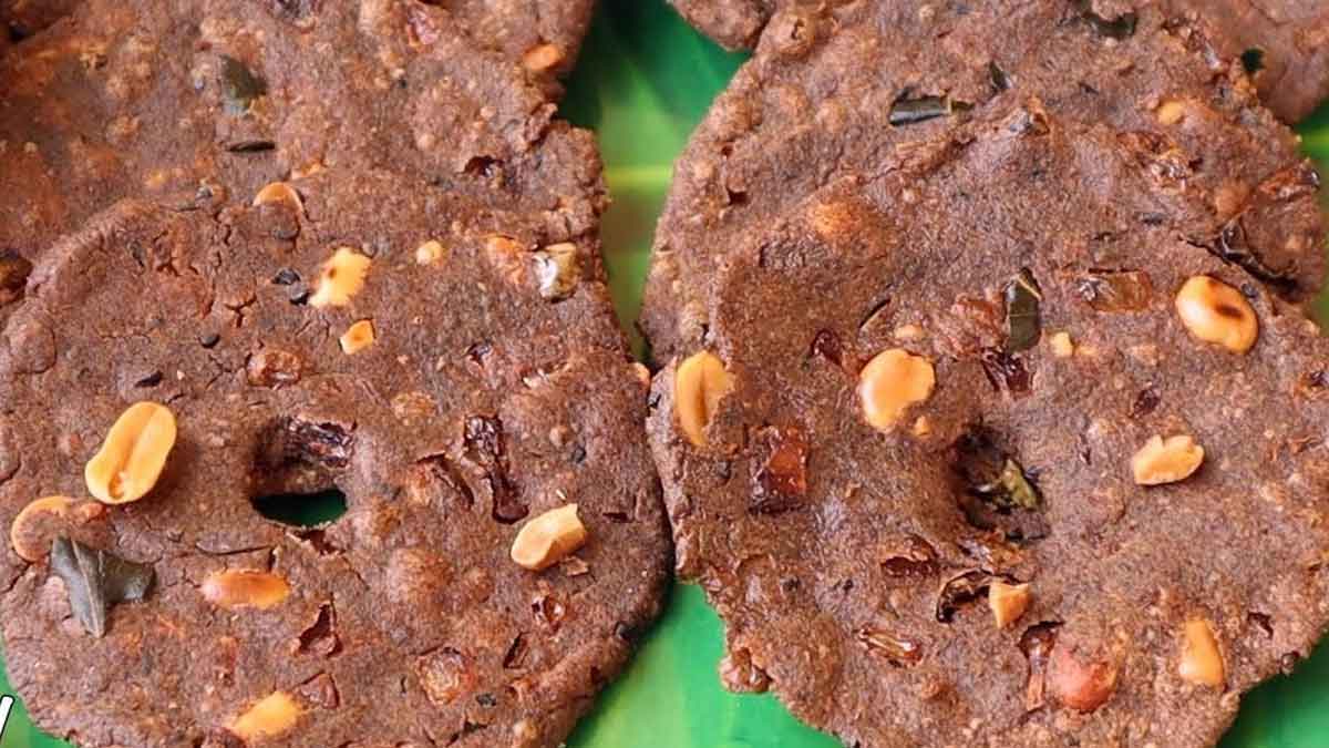 వేడి నీళ్లు – ముప్పావు కప్పు నుండి ఒక కప్పు, రాగిపిండి – ఒక కప్పు, బియ్యం పిండి – 2 టేబుల్ స్పూన్స్, నూనె – ఒక టేబుల్ స్పూన్, ఉప్పు – తగినంత, చిన్నగా తరిగిన పచ్చిమిర్చి – 1, చిన్నగా తరిగిన ఉల్లిపాయ – 1, తరిగిన కరివేపాకు – ఒక రెమ్మ, కారం – అర టీ స్పూన్, పసుపు – పావు టీ స్పూన్, వంటసోడా – పావు టీ స్పూన్, వేయించి ముక్కలుగా చేసిన పల్లీలు – కొద్దిగా.