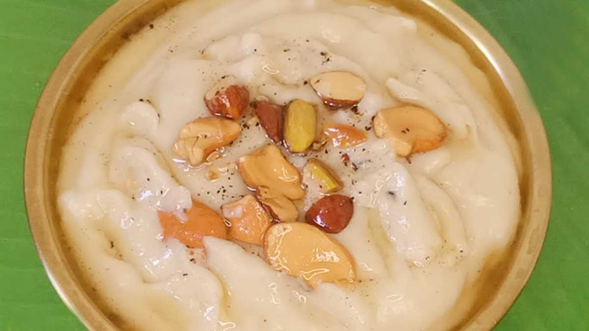 ముందుగా ఒక గిన్నెలో బియ్యాన్ని తీసుకుని నీళ్లు పోసి శుభ్రంగా కడుక్కోవాలి. తరువాత తగినన్ని నీళ్లు పోసి గంట పాటు నానబెట్టుకోవాలి. తరువాత ఈ బియ్యాన్ని ఒక జార్ లోకి తీసుకోవాలి. ఇందులోనే పచ్చికొబ్బరి ముక్కలు, నీళ్లు పోసి కొద్దిగా బరకగా ఉండేలా మిక్సీ పట్టుకోవాలి. కొబ్బరి ముక్కల వెనుక ఉండే నల్లటి భాగాన్ని తీసివేయాలి. ఇప్పుడు కళాయిలో పాలు పోసి వేడి చేయాలి. పాలు వేడయ్యాక ముందుగా మిక్సీ పట్టుకున్న బియ్యం మిశ్రమాన్ని వేసి కలపాలి. దీనిని దగ్గర పడే వరకు ఉడికించి స్టవ్ ఆఫ్ చేసి గోరు వెచ్చగా అయ్యే వరకు ఉంచాలి. ఇప్పుడు కళాయిలో బెల్లం తురుము, అర కప్పు నీళ్లు పోసి వేడి చేయాలి. బెల్లం కరిగే వరకు కలుపుతూ ఉండాలి. బెల్లం కరిగిన తరువాత అందులో యాలకుల పొడి వేసి కలిపి స్టవ్ ఆఫ్ చేసుకోవాలి.