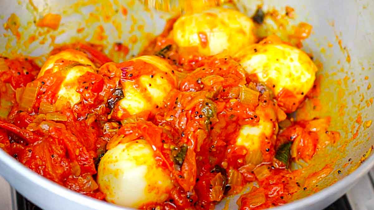 ముందుగా కళాయిలో ఎండుమిర్చి, దాల్చిన చెక్క, లవంగాలు, జీలకర్ర, ధనియాలు వేసి దోరగా వేయించాలి. తరువాత వీటిని రోట్లో వేసుకోవాలి. ఇందులోనే ఎండు కొబ్బరి ముక్కలు, అల్లం, వెల్లుల్లి రెబ్బలు వేసి మెత్తగా దంచుకుని ప్లేట్ లోకి తీసుకుని పక్కకు ఉంచాలి. తరువాత కళాయిలో నూనె వేసి వేడి చేయాలి. నూనె వేడయ్యాక ఆవాలు,మెంతులు వేసి వేయించాలి. తరువాత కరివేపాకు, పచ్చిమిర్చి, ఉల్లిపాయ ముక్కలు వేసి వేయించాలి. ఇవి వేగిన తరువాత టమాట ముక్కలు, ఉప్పు, పసుపు వేసి కలపాలి. తరువాత మూత పెట్టి మధ్య మధ్యలో కలుపుతూ టమాట ముక్కలు మెత్తగా అయ్యే వరకు ఉడికించాలి. టమాట ముక్కలు ఉడికిన తరువాత కారం వేసి కలపాలి. తరువాత కోడిగుడ్లకు గాట్లు పెట్టుకుని వేసుకోవాలి. అంతా కలిసేలా చక్కగా కలుపుకున్న తరువాత అరగ్లాస్ నీళ్లు పోసి కలపాలి.